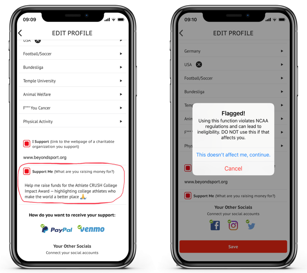 - We have added a warning pop-up notification for all users before they add the “Support Me” section. While NCAA athletes are allowed to fundraise when they follow the rules outlined above, we encourage student athletes competing in the NCAA system to consult with their compliance officer before adding this feature to their profile.